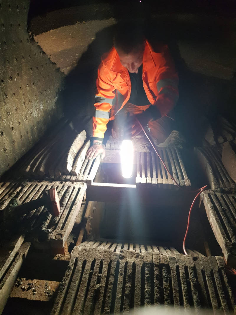 Inside the firebox, the grates on which the fire burns when the locomotive is fired up were checked. Over time, however, these cast-iron grate bars scale or bend due to thermal stress. They then have to be replaced with new ones.