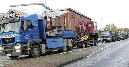 Im Konvoi raus aus der Stadt: Die Lokomotiven fuhren auf Tiefladern in ihre neue Heimat nach Wittenberge. |